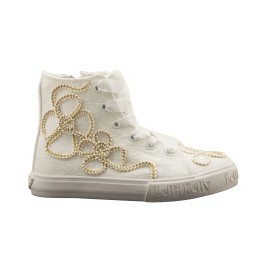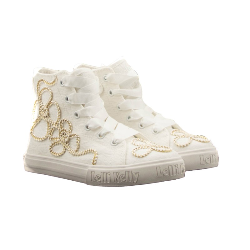 La linea Tela Ricamata di Lelli Kelly si ispira alla tecnica di ricamo denominata Cornely, che consente la cucitura di elementi nastrati direttamente sul tessuto. Grazie a questa tecnica speciale, meravigliosi intrecci di ricami e decorazioni si sviluppano su una tela bianca con effetto goffrato, dando vita a trame incantevoli e linee armoniose che aggiungono tridimensionalità e movimento alla calzatura.