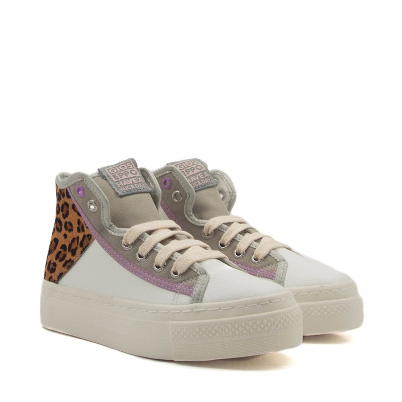 Le sneackers divertenti! Sneackers a stivaletto con lacci e base stile leopard con combo di colori lilla, grigio e bianco. Fodera e soletta imbottita con tessuta traspirante. Soletta con l'innovatore sitema Gio effetto memory foam. suola vulcanizzata a doppia cassetta. Non manca niente! non perderti la nuova stagione di Gioseppo Kids.
