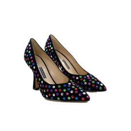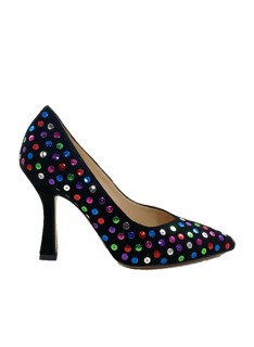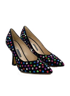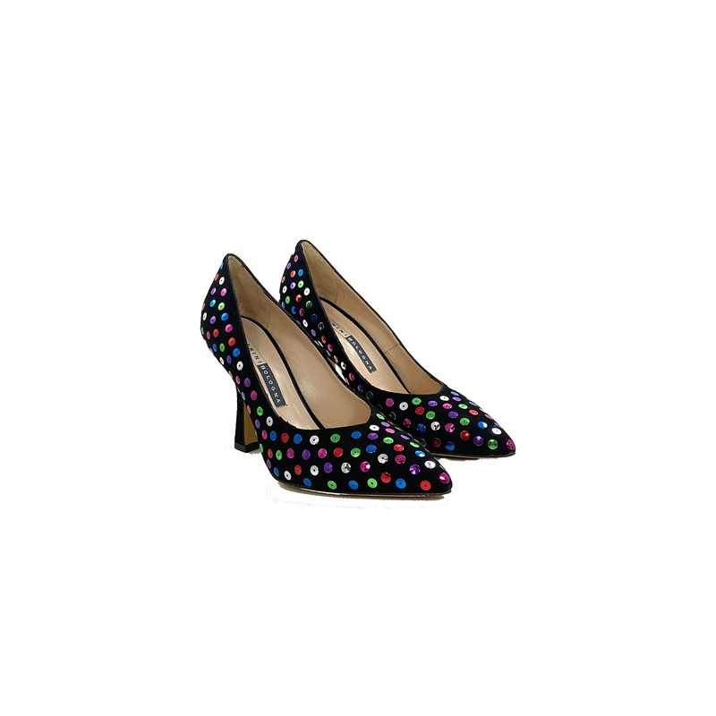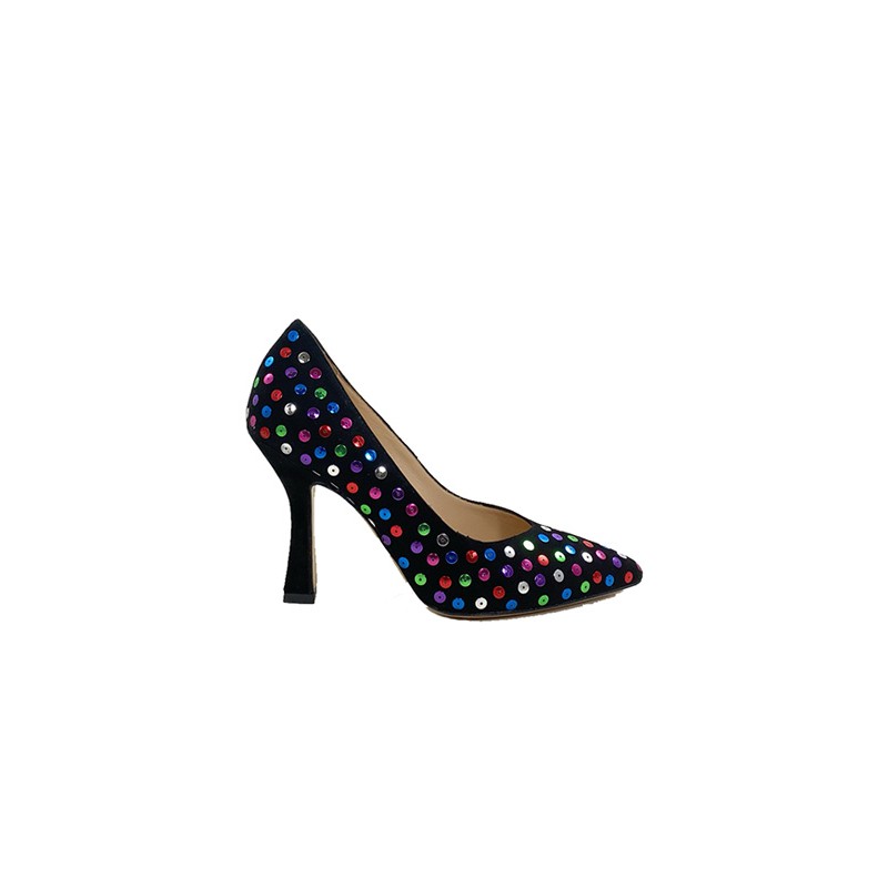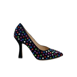 Decolletè realizzato in pregiato camoscio impreziosito dalle pailettes multicolor cucite nella tomaia. La fodera e il sottopiede sono in pelle color carne e il tacco, a rocchetto, è di (h) 9 cm ed è fasciato in camoscio nero. Una scarpa con uno stile unico e sopraffine, ideale per le occasioni dove si deve colpire con il proprio look. Made in Italy.