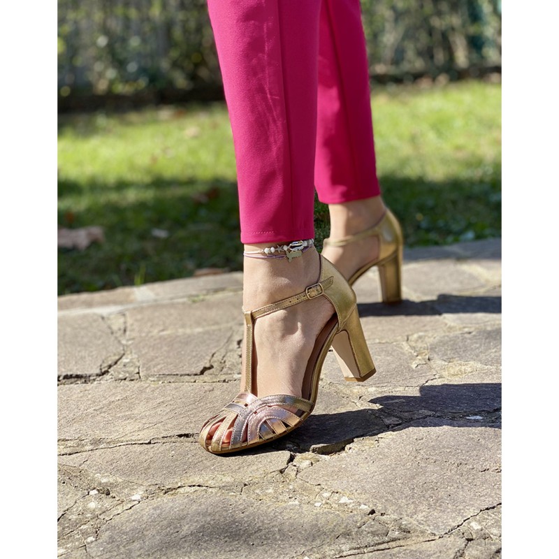 Décolleté realizzato in morbidissima pelle laminata impreziosito dal mix di colori; fodera e sottopiede in pelle color carne e comoda chiusura con fibbia. Il tacco, fasciato in pelle, è di 9 cm. Made in Italy