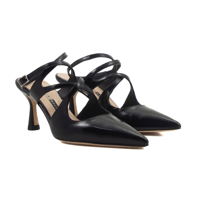 Scarpa dalla punta sfilata realizzata in morbida pelle, impreziosita dai cinturini a giro collo; fodera e sottopiede in pelle color carne. Il tacco rocchetto fasciato in pelle è di 7 cm. Made in Italy