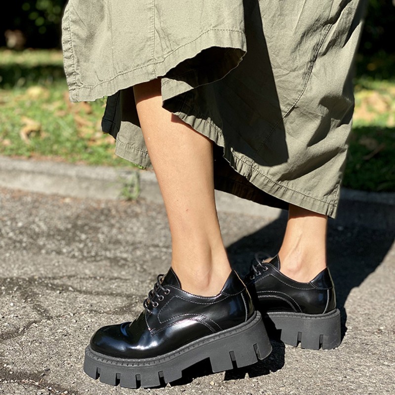 Stringata realizzata in pelle lucida. Una rivisitazione grintosa di un must have del gaurdaroba femminile. Made in Italy