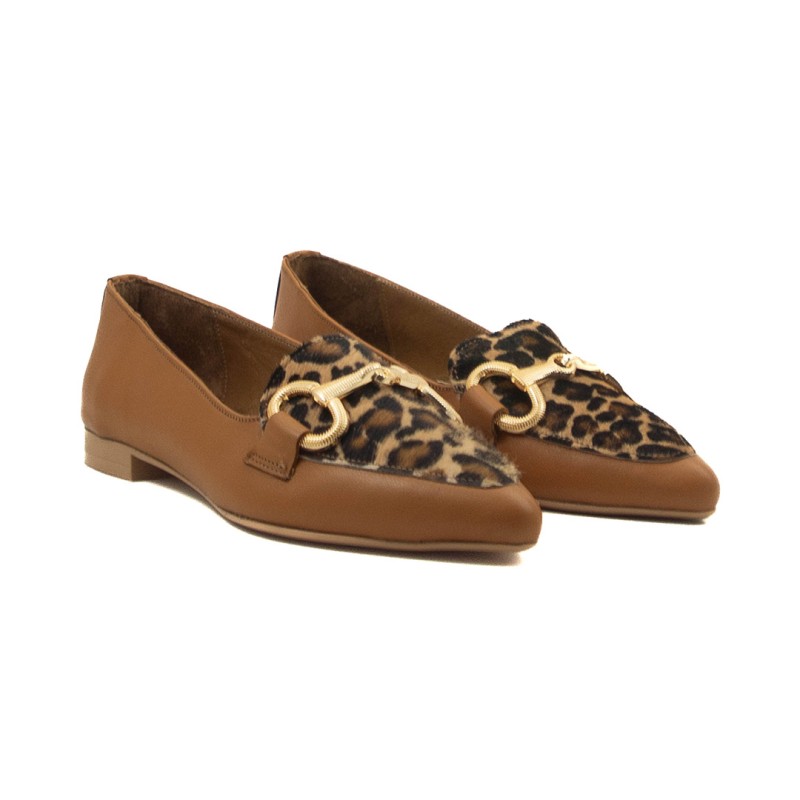 Mocassino dalla forma sfilata realizzato in pelle impreziosito dalla vaschetta maculata e dal morsetto in contrasto. Fodera e sottopiede in pelle e fondo in gomma leggera.