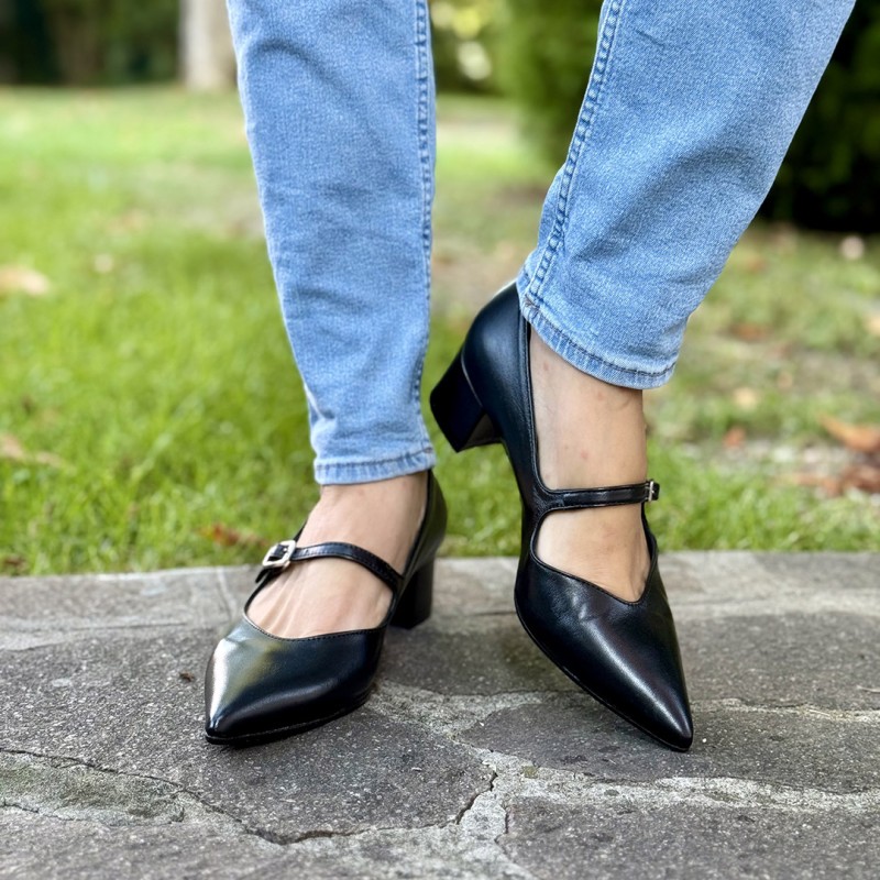 Scarpa dalla forma sfilata realizzata in pelle, impreziosita dal cinturino e dalla fibbia. Fodera e sottopiede in pelle e tacco fasciato di 4,5 cm. Ideale per un tocco di glamour nella vita quotidiana. Made in Italy
