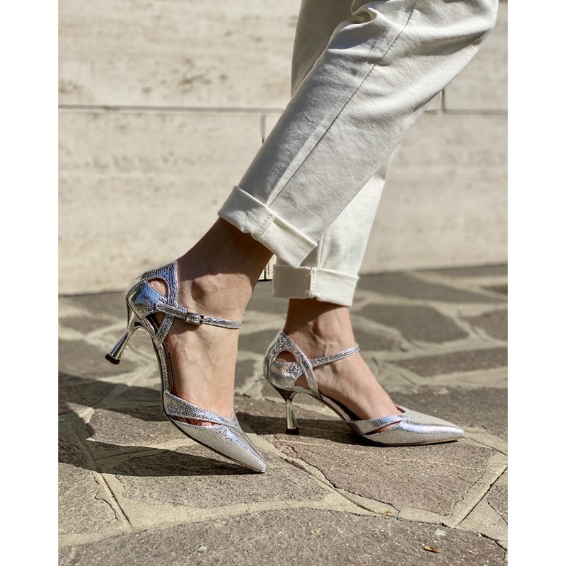 Décolleté realizzato in morbida pelle laminata firmato Chiarini Bologna, impreziosito dal cinturino. Foedera e sottopiede sono in pelle color carne e il tacco è di 9 cm. Made in Italy