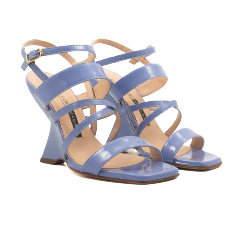 Sandalo realizzato in vernice, impreziosita dal design particolare; fodera e sottopiede in pelle color carne. La zeppa fasciato in vernice è di 10 cm. Made in Italy