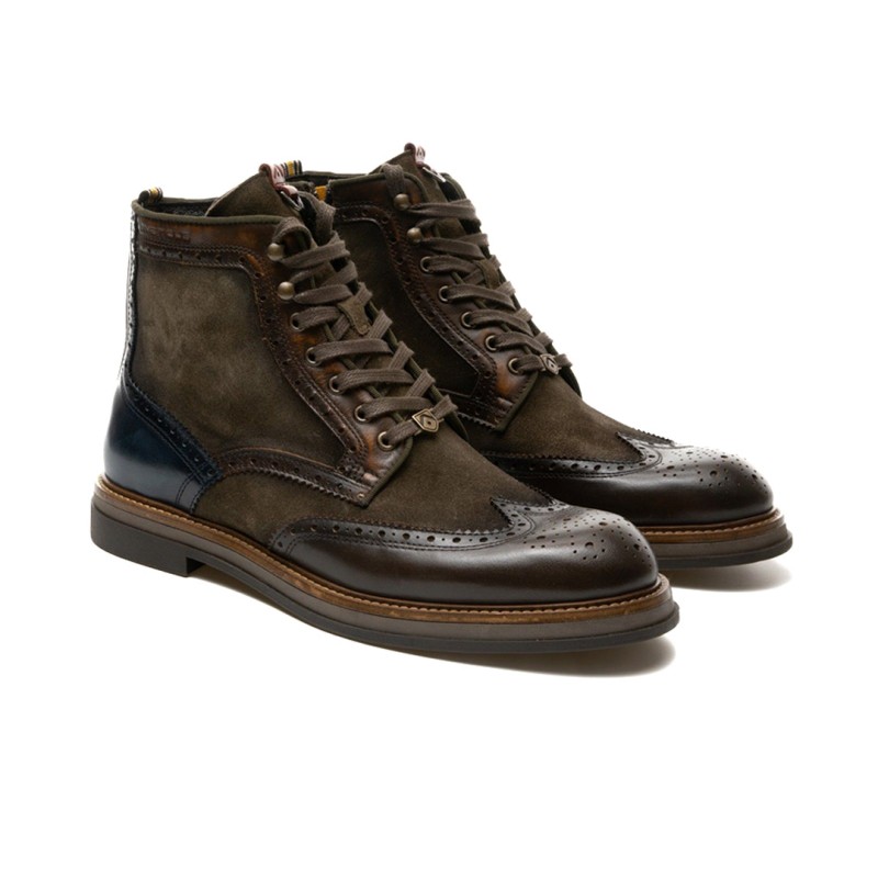 Un boot d’ispirazione classica con dettagli traforati sul davanti e sui lati. Questa versione presenta una combinazione di pelle e camoscio, con un pannello laterale in camoscio a contrasto. Un’opzione sofisticata adatta sia a contesti formali che informali.